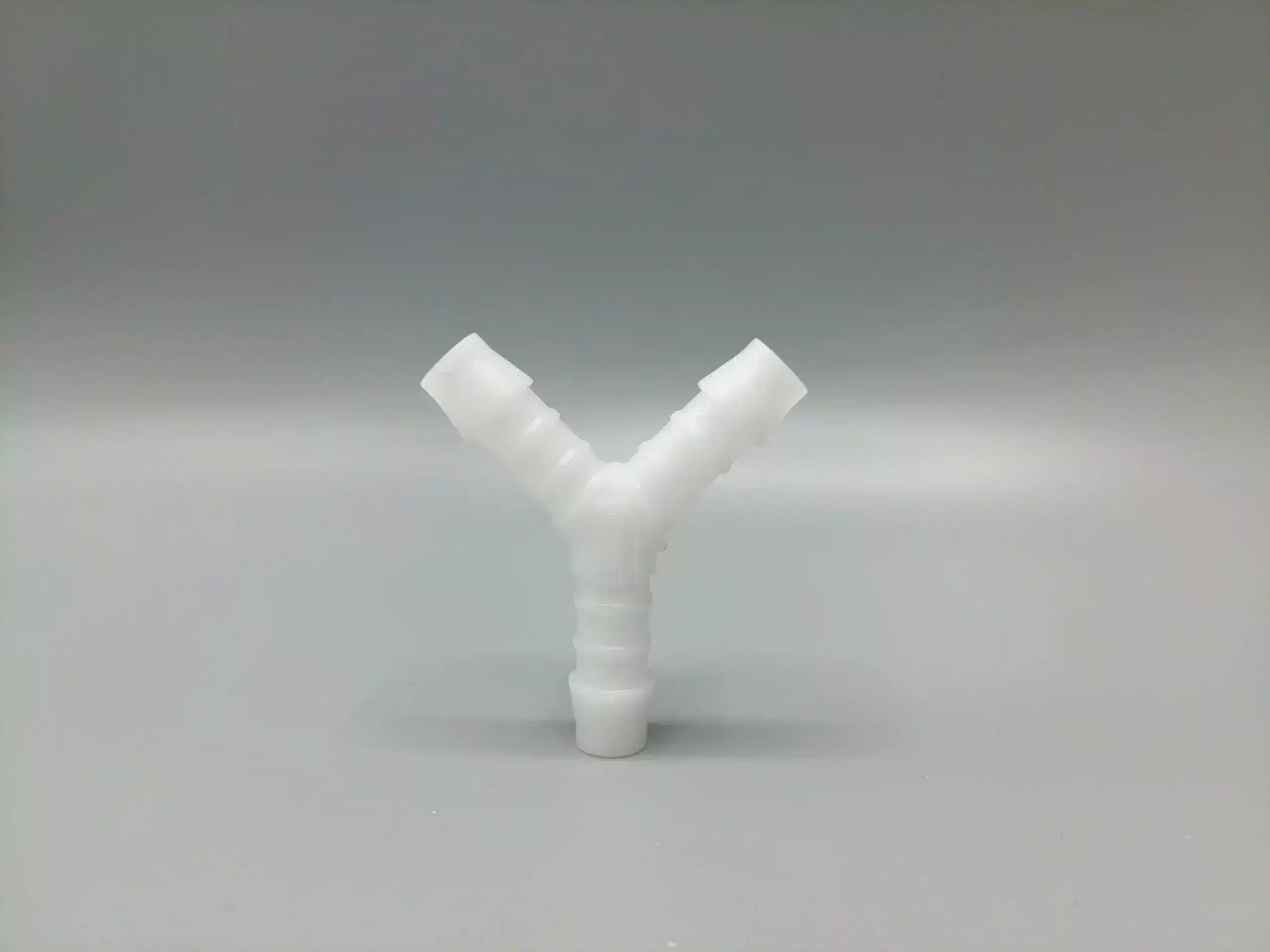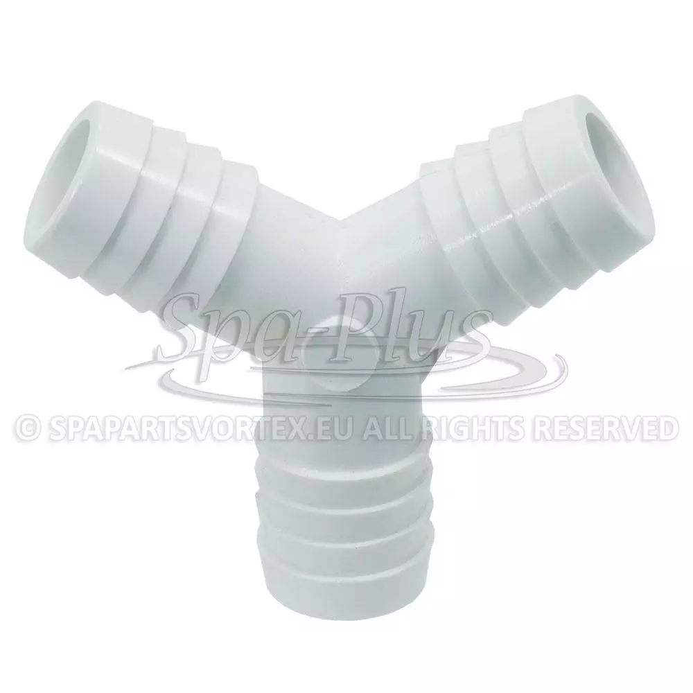 The 3/4 inch Wye Barb is a white Y-shaped connector with an internal diameter of 15mm, an overall length of 80mm, and a depth of 23mm. Designed for use with 3/4 inch vinyl tubing and metal clips. For a secure and leak free connection we recommend using Blue PVC Glue.