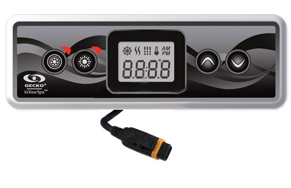 The Gecko Overlay IN.K300 (1 Pump) is a black control overlay with 4 buttons: Pump, Light, Up and Down. Compatible with the Gecko IN.K300 topside control system, ideal for spas with 1 pump and no blower.