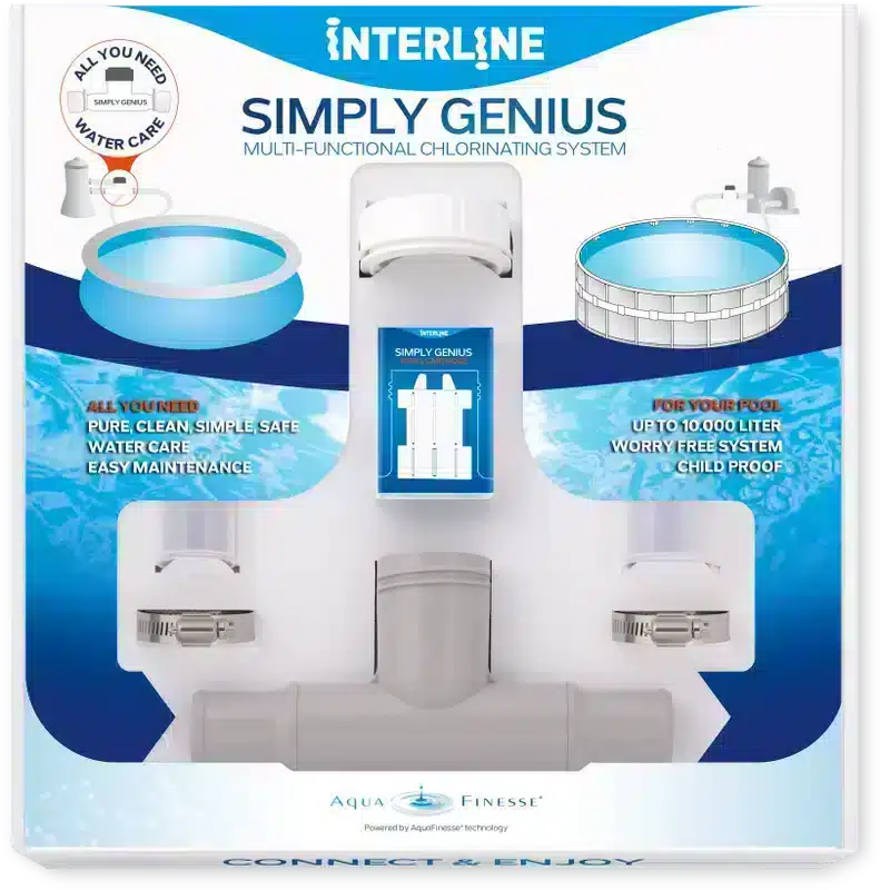 The Interline Simply Genius Starter Kit is an innovative, automatic water maintenance system for above-ground pools. This user-friendly system ensures clean, clear, and safe pool water without any hassle. Thanks to its unique tablets, it treats up to 10,000 liters of water per week, without a float for children to play with. Easy to install on the pool pump: Connect & Enjoy!