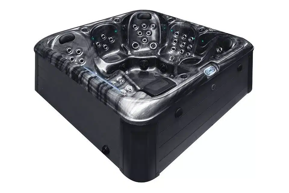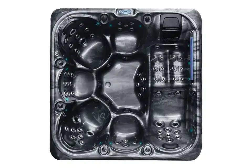 Devine Spas Luxury 6-Person Spa – Powerful Massage & Atmospheric Wellness This luxurious Devine Spas hot tub is designed for those who want to enjoy intense relaxation and comfort together. With room for 6 people – 5 seats and 1 comfortable lounger – this spa offers an ideal combination of social wellness and powerful individual massage. The hot tub features no fewer than 75 active hydrotherapy jets, powered by three powerful 3.0 HP massage pumps and supported by a circulation pump. This provides a deep, evenly distributed massage over the entire body. The reliable Balboa control and heating system (3.0 kW) guarantees stable performance and precise temperature control. For clean and clear water, this spa is equipped with a fully automatic filtration system and an ozone oxidation system, which keeps maintenance to a minimum. The luxurious appearance is enhanced by 16 LED lights, StarBrite LED underwater lighting, LED illuminated corner panels and two illuminated water arches, which together create an atmospheric wellness experience, both during the day and in the evening. In addition, the jacuzzi has a Bluetooth audio system with 2 built-in speakers, so you can enjoy your favorite music while relaxing. The multi-layered shell construction, maintenance-free cabinet, and triple-layered thermal insulation ensure durability, excellent heat retention, and energy efficiency. Key Benefits: 6-person capacity (5 seats and 1 lounger) 75 active hydrotherapy jets for an intense massage Three powerful 3.0 HP pumps plus a circulation pump Balboa heating and control system (3.0 kW) Fully automatic filtration system with ozone purification Deluxe LED lighting, StarBrite underwater lighting, and illuminated water arches Bluetooth audio with built-in speakers Maintenance-free, robust construction Excellent insulation and energy efficiency Ideal for shared use and intense relaxation Measuring 214 x 214 x 82 cm and with a water capacity of 1005 liters, this Devine Spas hot tub is an excellent choice for those looking for a spacious, luxurious spa with powerful massage performance and a high-quality appearance.